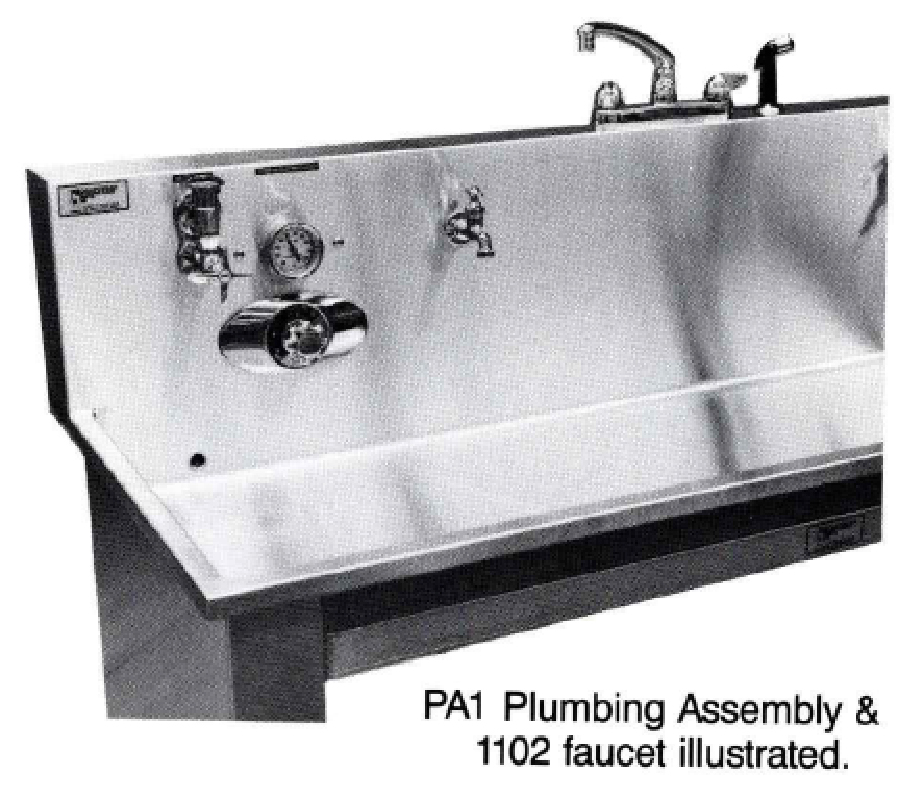 Same as PA2 (above) plus one 1201 (shown) Triple valve faucet plumbed to temperature control in center of sink.