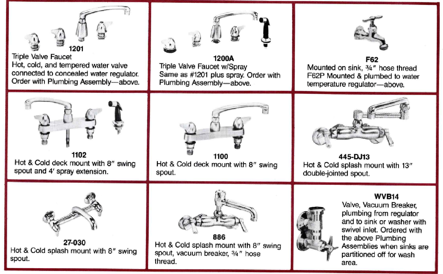 One concealed water temperature thermostatic control valve, one set checkstops, one 3½" dial thermometer, one Model WVB14 (shown) volume control valve with vacuum breaker for sink inlet swivel, one Model F62P faucet plumbed to temperature control valve, one Standpipe, one increased backsplash to 12" high and width to 5".
