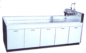 Multi-use, heavy duty stainless sinks for Schools, Universities, Laboratories and Photo Labs. Heavy duty construction features 16 gauge type 316 LC #4 polished finish stainless sink available in square or coved corners. Integral 12" stainless side splash with 5" return for wall protection and optional plumbing fixtures. Sinks are heliarc welded, passsivated and polished. Stainless provides superior temperature holding qualities and bottom is undercoated for sound insulation and condensation prevention. sinks include 16 gauge matching stainless base, sink supports and base leveling pads. Options include stainless shelf, stainless cabinet with shelf and doors, plumbing assemblies faucets, fume vents, water filters, eye wash.